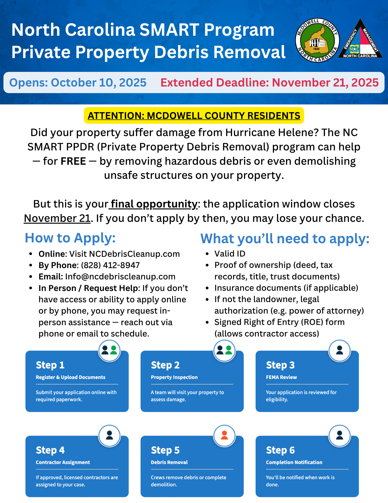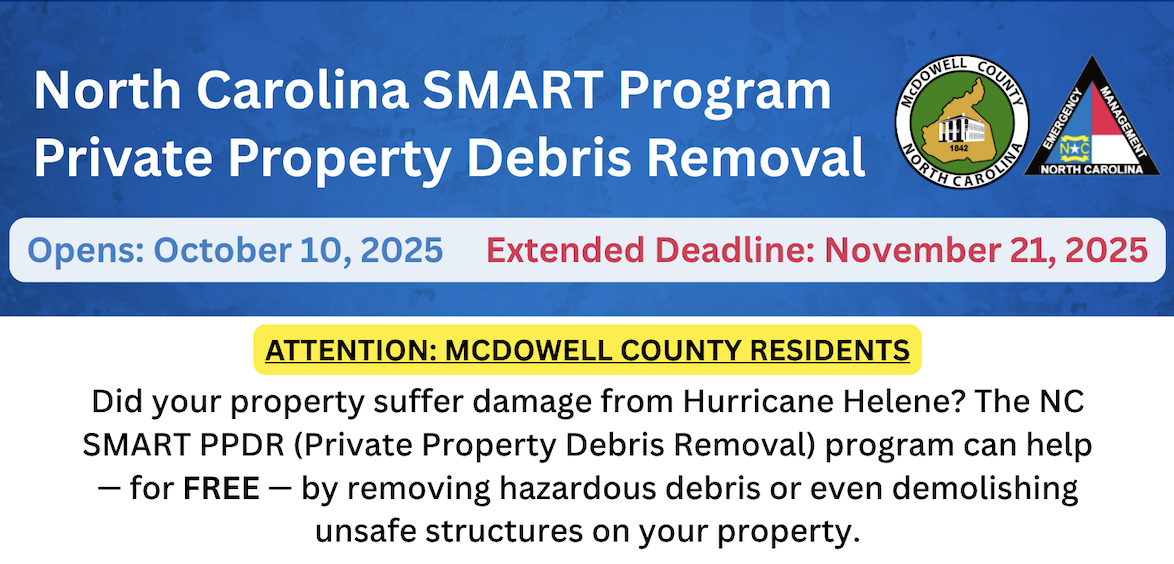 The NC SMART PPDR (Private Property Debris Removal) program can help remove storm debris or demolish unsafe structures for free!